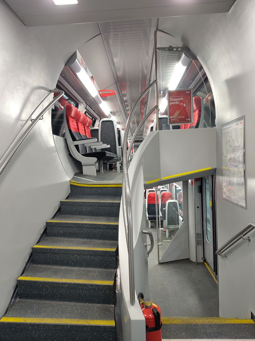 | A-ÖBB 50 81 26-33 194-3 Bmpvz. Interior of double deck car, currently used in S-Bahn Wien. In 2023 this car was rebuilt from the 50 81 26-33 534-0 Bmpz-dl which was built in 2000. From september 2026 some of these cars will go to Styria as their trains are replaced by new KISS units. An interesting design quirk is the oval shape formed by the walls at the end of the upper floor. Wien, 2025-11-26. |