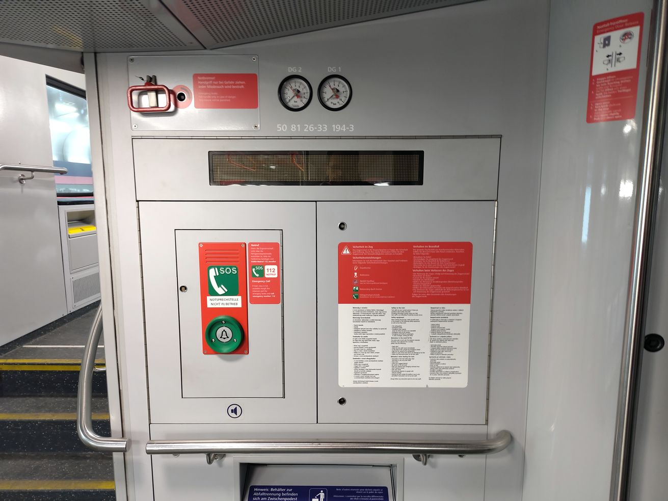 | A-ÖBB 50 81 26-33 194-3 Bmpvz. Interior near the entrance door where you see the coach number, pressure of brake pipe, emergency brake, destination display, emergency intercom and instructions as well as a rubbish bin. Wien, 2025-11-26. |