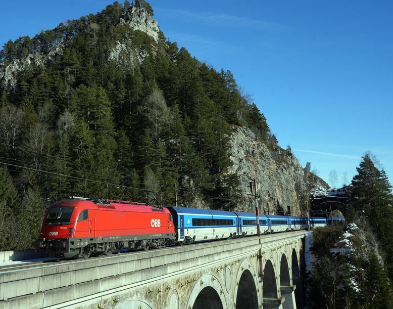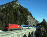 | A-ÖBB 91 81 1216 228-7 pulling a Czech ComfortJet, crossing the Krauselklauseviadukt near Breitenstein. 2026-01-14. |