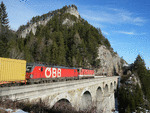 | A-ÖBB 91 81 1144 043-7 and A-ÖBB 91 81 1293 082-4 in front of a train of msc containers. Krauselklauseviadukt near Breitenstein. 2026-01-14. |