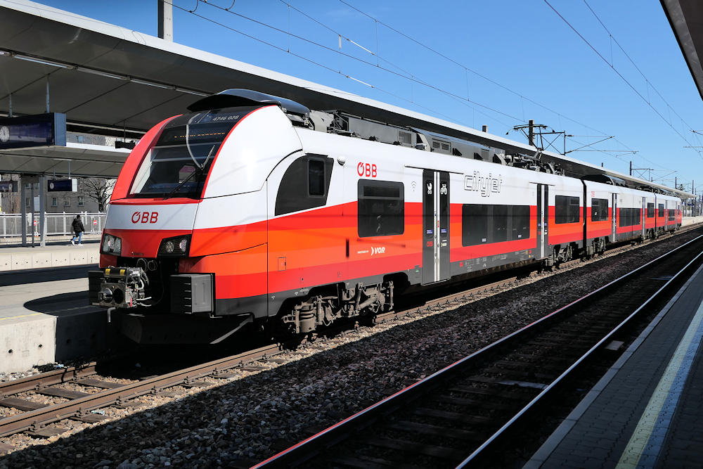 | A-ÖBB 91 81 7046 011-7 at Bruck an der Mur, line S1 to Graz. This unit will go to VOR (Verkehrsverbund Ost-Region) when class 4744 is delivered (sometime 2017ā) |