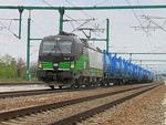 A private electric locomotive SIEMENS Vectron with number 193 763 at railway station Pazardjik with freight train. This machine is part of European locomotive leasing and now is working for private operator RCC ("Rail Cargo Carrier") A video movie about crossing the train through railway station Pazardjik , you can see on this adress: