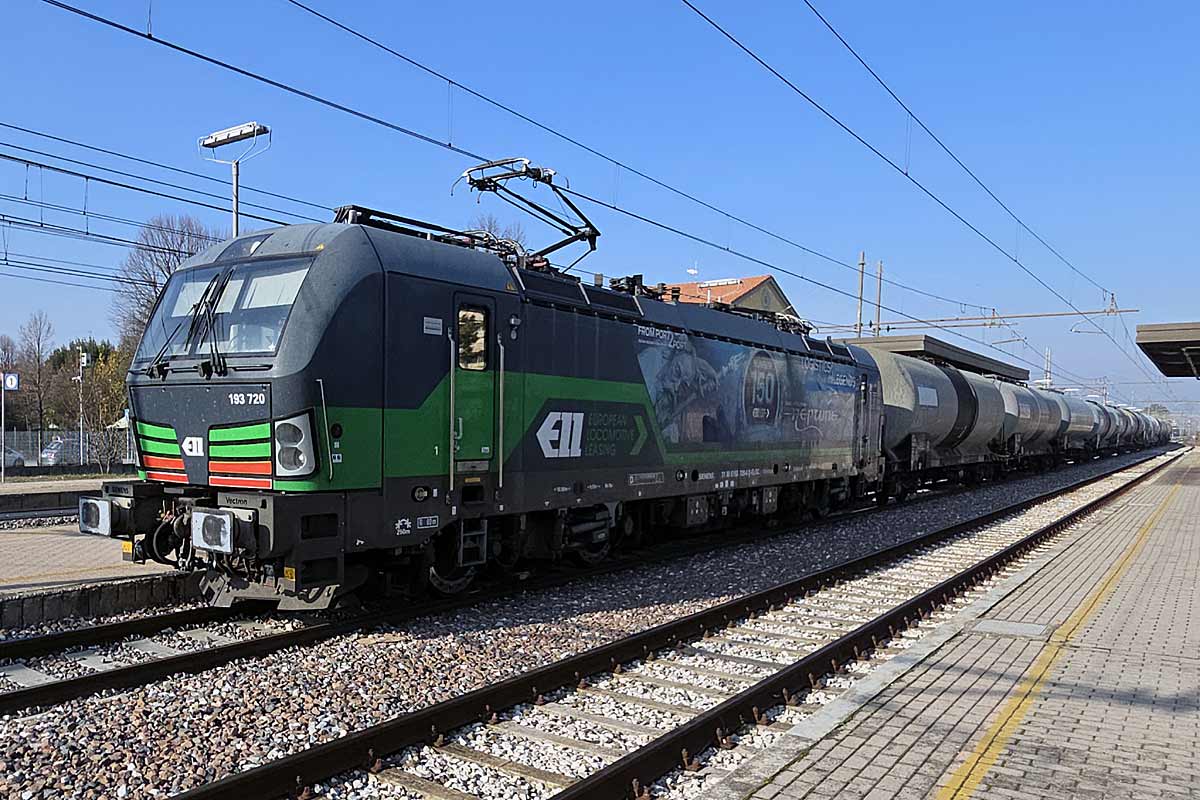 LTE Logistik and transport Austrian electric loco 193 720 (NVR 91 80 6193 720-0 D-ELOC) in special ELL NUMBER 150 colors slowing down its tank train on on track 3 at San Giorgio di Piano BO station. 12/11/2025.