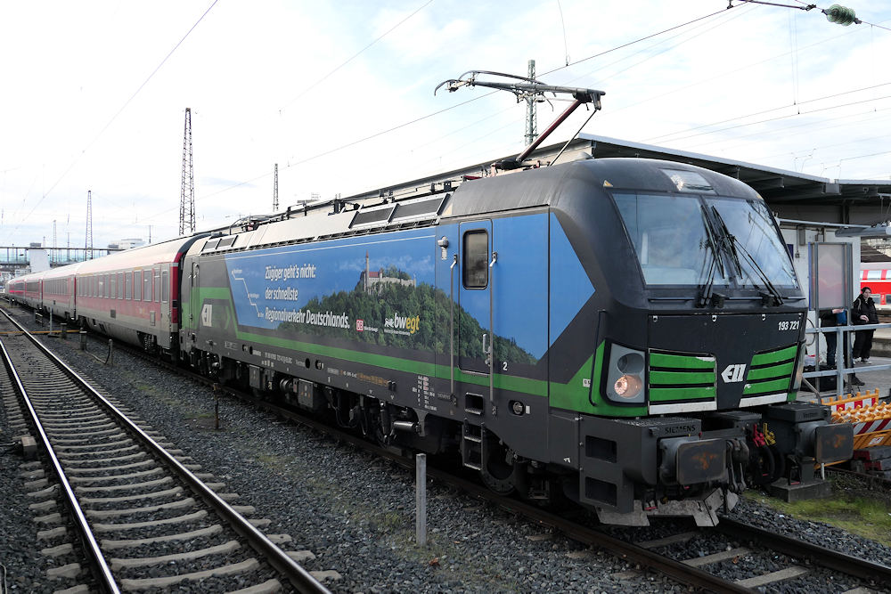 ELL - Austria (for DB) In December 2022 an IRE service over the new high speed line between Wendlingen and Ulm started with former DB IC coaches sandwiched between two Vectron locomotives leased from ELL. ELL 193 721 is seen with this train in Ulm. Ulm, 29-12-2022 Photo by Marco van Uden |