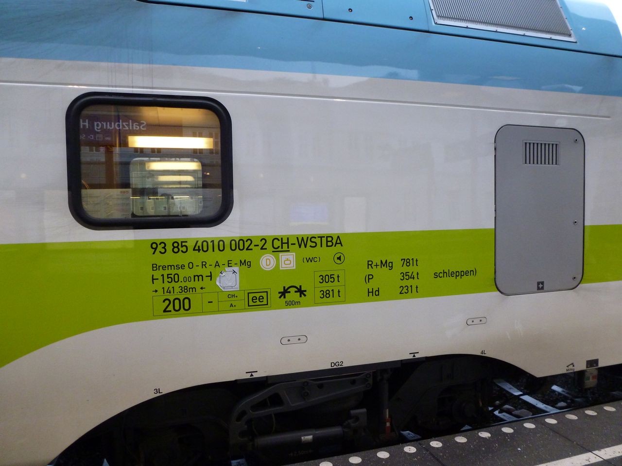 | Westbahn unit 93 85 4010 002-2, inscription on the end car. Even though these trains go to Freilassing (Germany) every day (that's where this unit was just coming from), the "D" symbol cannot be found in the raster. Salzburg Hbf (as you can see reflecting in the window), 2012-01-01. |
