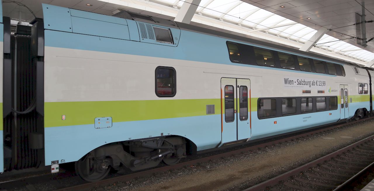 | Westbahn 93 85 4010 003-0 CH-WSTBA with middle car 93 85 4010 203-6, train WB 911 to Wien Westbahnhof. Salzburg Hauptbahnhof, 2019-11-10. |