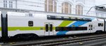 | Westbahn car 93 85 4010 407-3. Seats arranged in rows on the upper levels, wheelchair area on the lower level, Westcafé on one end, smoking lounge on the other end. Salzburg Hbf, track 1, 2012-01-01. |
