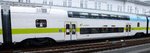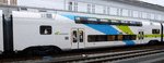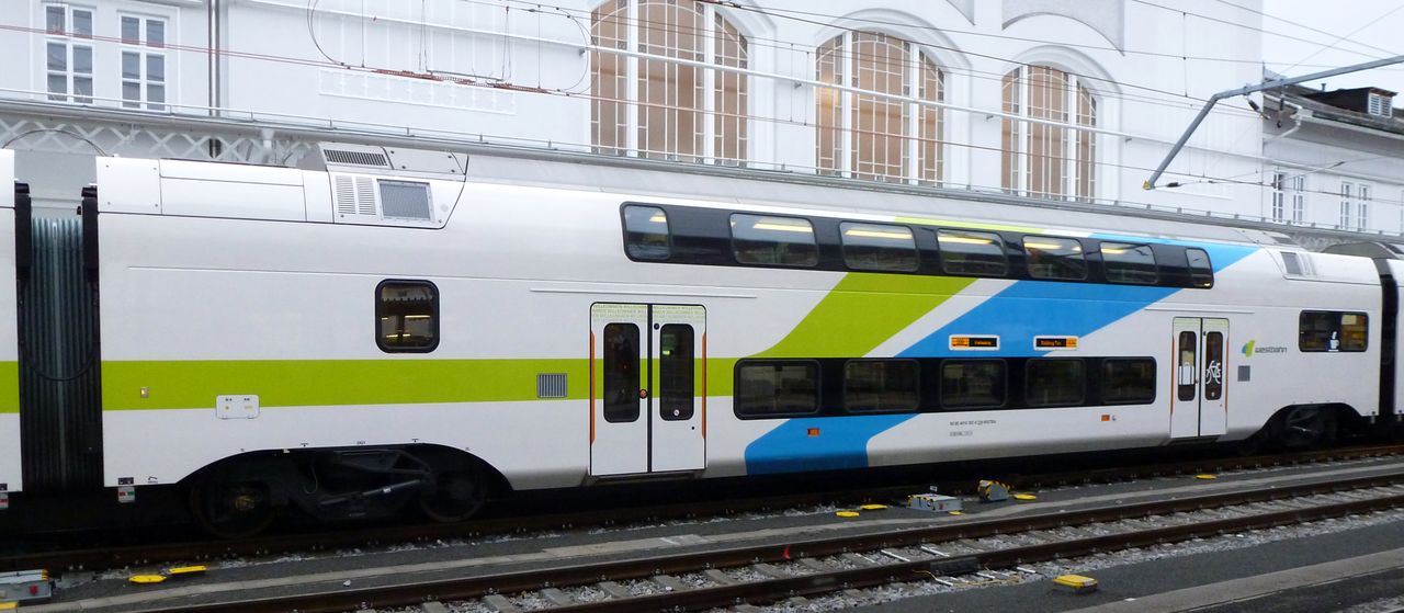 | Westbahn car 93 85 4010 107-9. Four-seat groups around tables on both levels, bicycle and baggage rack on the lower level. Both end cars are powered, so the inverters and transformers take up space on the end above the bogie. Salzburg Hbf, track 1, 2012-01-01. |