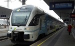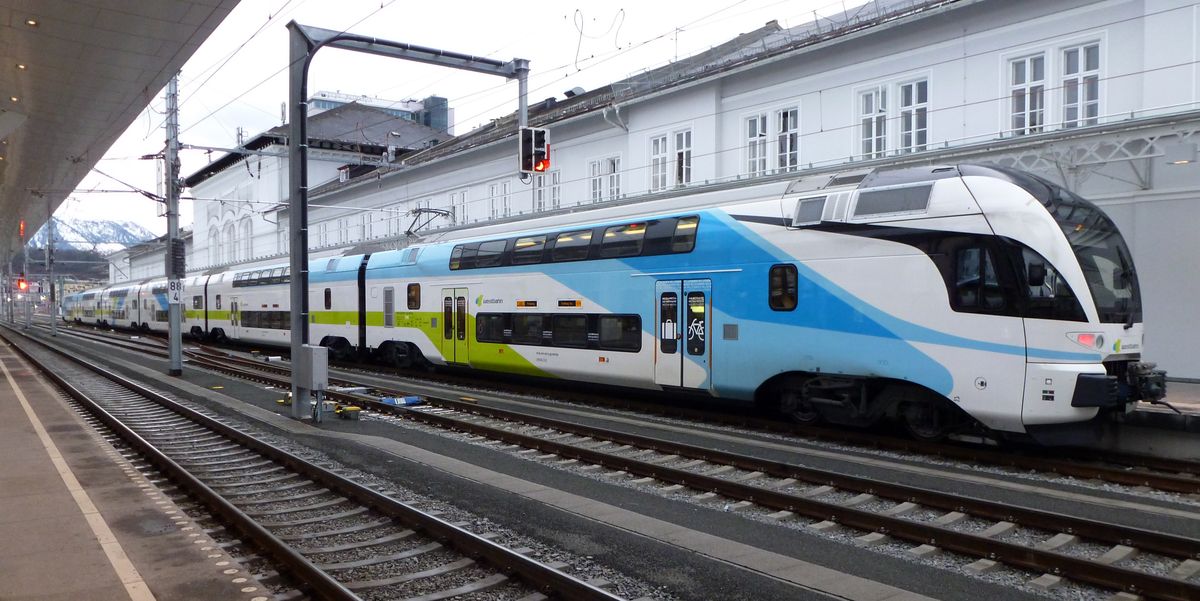 | Westbahn unit 93 85 4010 007-1 (this number refers to the whole train), consisting of the cars (93 85 4010) 107-9, 207-7, 307-5, 407-3, 507-0 and 607-8. Train WB 17514 "Gute Reise im Zug" Wien Westbf - Freilassing. Salzburg Hbf, track 1, 2012-01-01. |