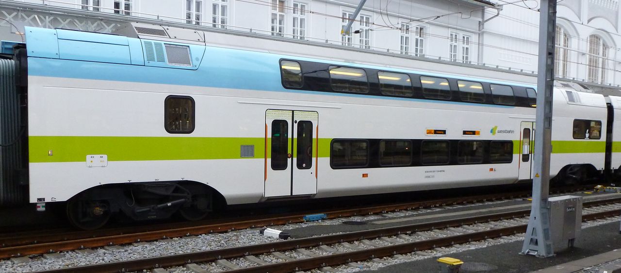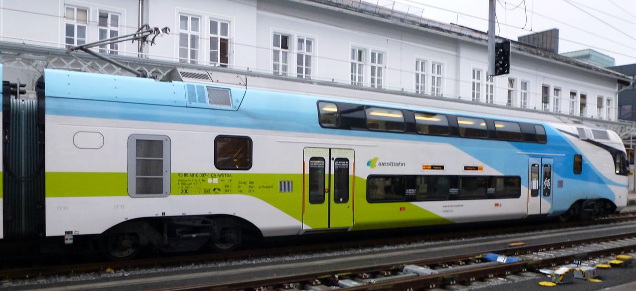 | Westbahn car 93 85 4010 507-0. Seats arranged in rows on both levels, bicycle and baggage rack on the lower level, Westcafé on one end. Salzburg Hbf, track 1, 2012-01-01. |