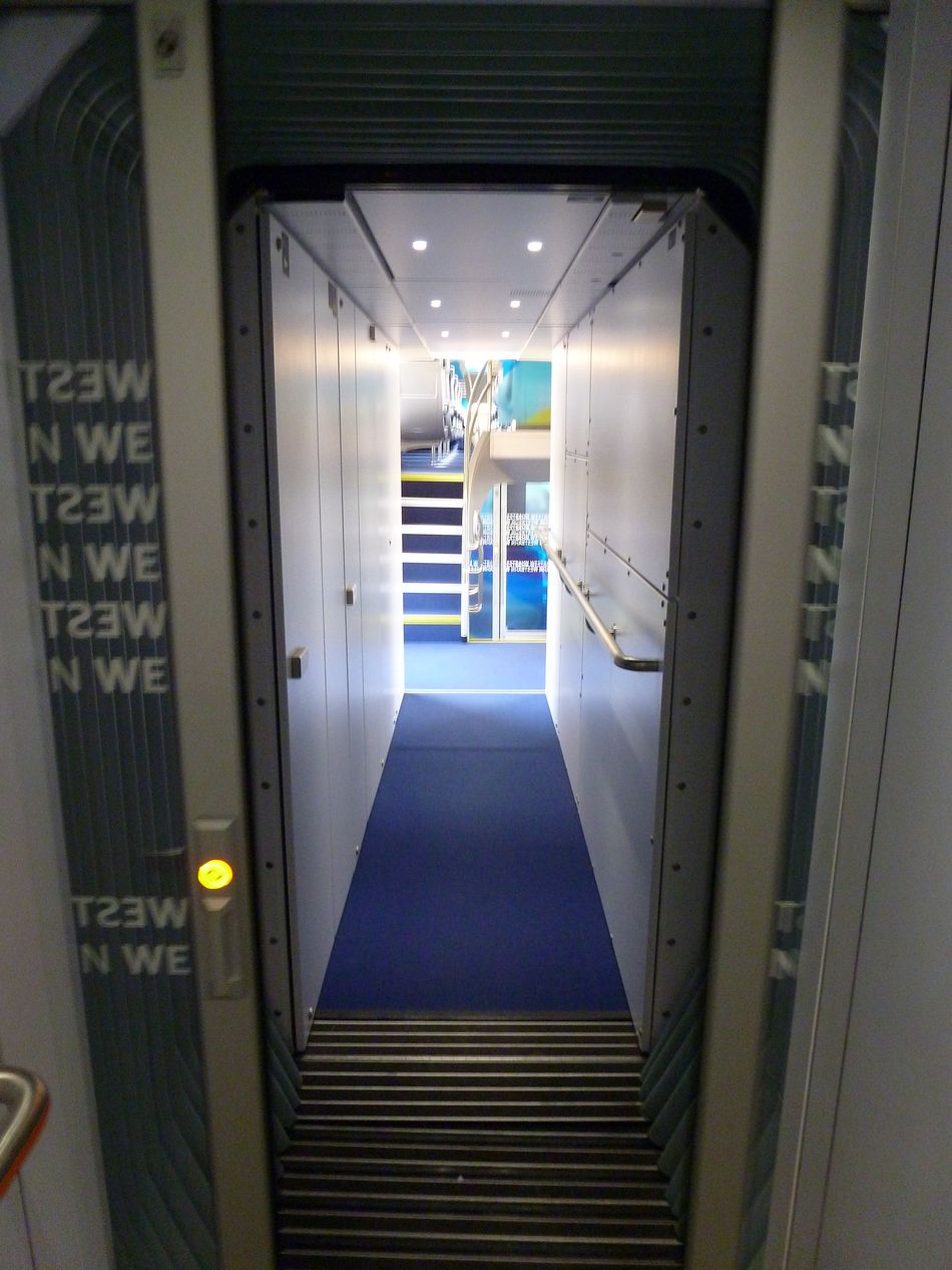 Westbahn, upper floor of an end car. Above the doors, the door mechanism