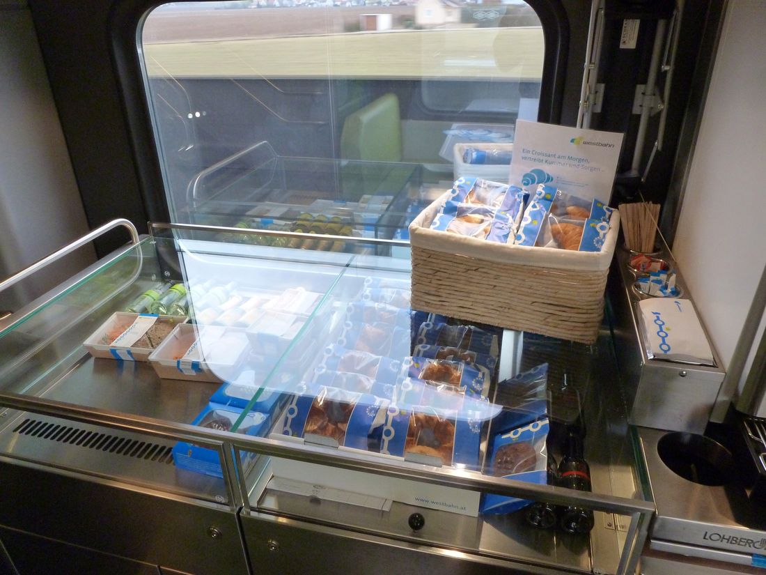 Westbahn, "Westcafé" in a middle car. Passengers can take a croissant
