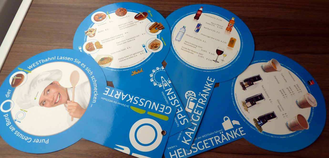 Westbahn, menu card. These drinks and snacks can be obtained from the