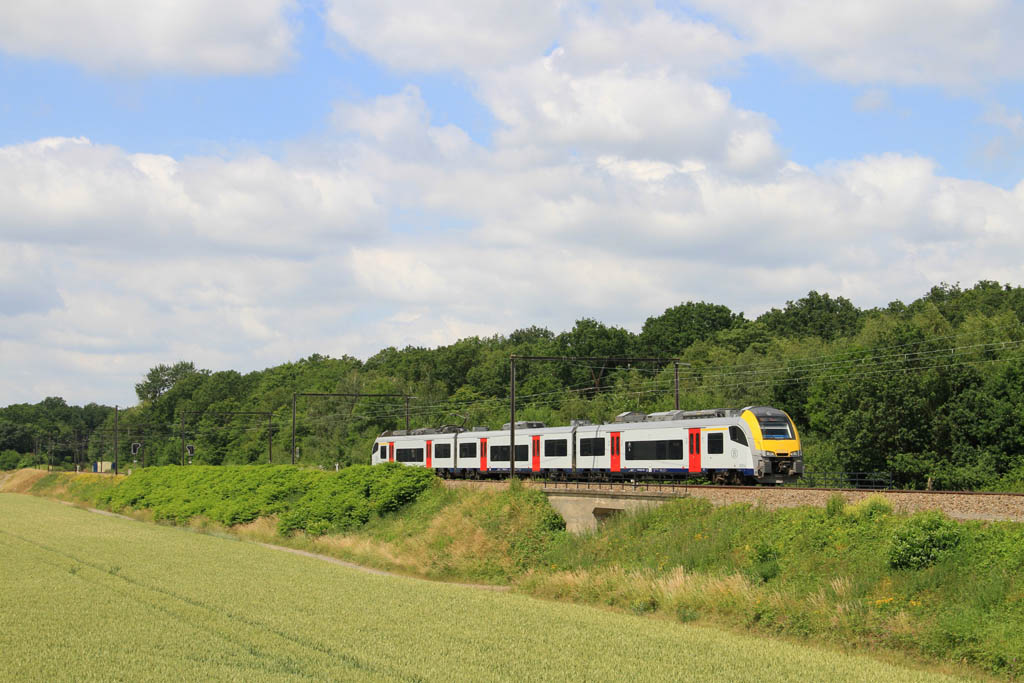 EMU 08054 as passenger train L between Charleroi-Sud and Namur, is passing in Franière on line 130, 21 June 2014