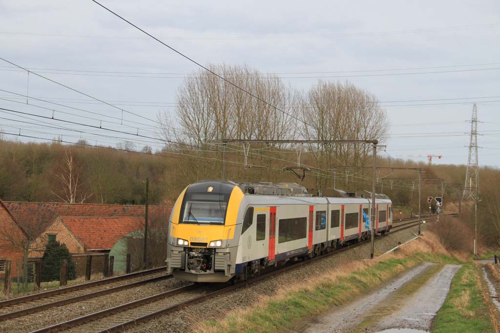 EMU 08081 as passenger train L between Bruxelles-Midi and Aalst, is passing in Sint-Martens-Bodegem on line 50, 8 February 2014.