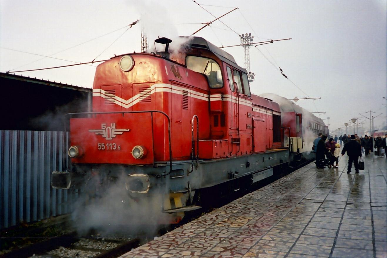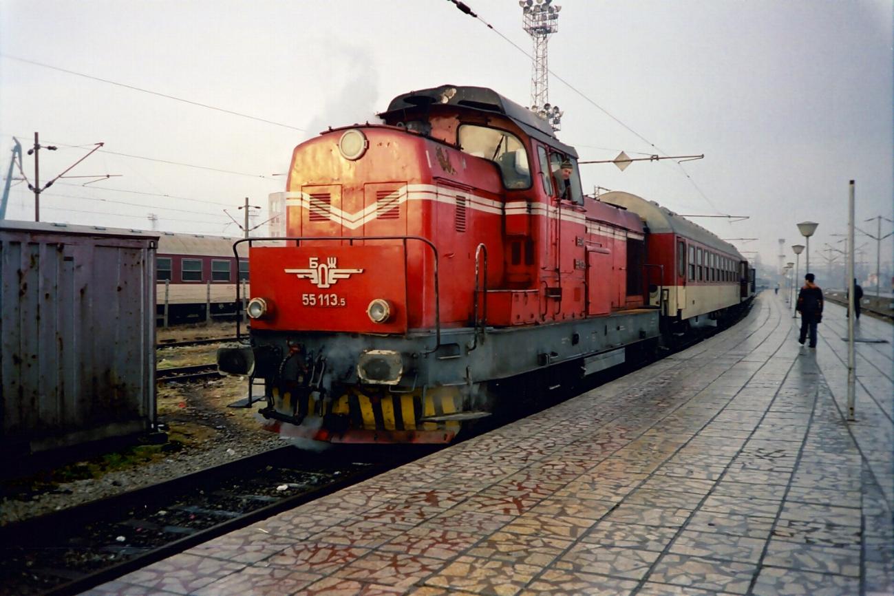 BDZ shunter 55133-5 built by FAUR Romania at Varna station with morning local train 29201 from Dobrich. It is not very unusual to see a class 55 shunter loco on diesel haul passenger local train