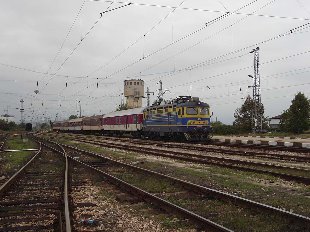 BDZ Electric locomotive 44.001-6 ( home depot Sofia) arrives at railway station Septemvri with fast train Sofia -Poduiane - Iskar - Ihtiman - Kostenec - Belovo - Septemvri - Pazardjik - Plovdiv - Trakia - Belozem - Chirpan - Mihailovo - Stara Zagora - Nova Zagora - Iambol - Zimnica - Straldja - Karnobat - Aitos - Vladimir Pavlov - Burgas BV 8615