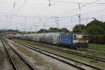 46002 at railway station Mezdra with freight train.