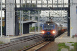 A private electric locomotive SIEMENS Smartron with number 91 52 10 80 025 - 5 , owned by private operator "Bulmarket" cross through railway station Pazardjik with freight train.
