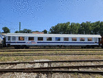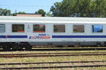 A private passenger car, type Avmz with number 61 80 19 91 347 - 3, owned by private operator "PIMK Rail Express", part of "PIMK Rail", standing at railway station Septemvri in composition of test train.