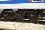 A boogies of private passenger car, type Avmz with number 61 80 19 91 347 - 3, owned by private operator "PIMK Rail Express", part of "PIMK Rail", standing at railway station Septemvri in composition of test train.