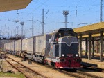 A private diesel locomotive with number 92 53 0 81 0911 - 3 , owned by private operator "PIMK Rail" at central railway station Plovdiv with freight train.