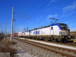 A private electric locomotive SIEMENS Vectron with number 91 52 10 81 972 - 7, onwed by private operator "PIMK Rail" at railway station Todor Kableshkov before pulling a freight train.