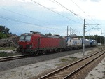 A private electric locomotive SIEMENS Vectron with number 91 52 10 81 972 - 7 , owned by private operator "PIMK Rail" standing at railway station Todor Kableshkov with freight train.