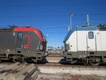 A view between 2 private electric locomotives owned by private operator "PIMK Rail" standing at railway station Todor Kableshkov after pulling a freight trains.