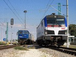 A view from 2 private locomotives , all owned by private operator "PIMK Rail" , standing at railway station Todor Kableshkov with freight trains.