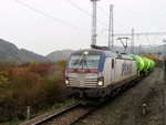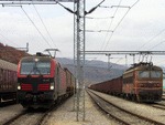 A private electric locomotive SIEMENS Vectron with number 91 52 10 81 972 - 7 , owned by private operator "PIMK Rail" at railway station Kalotina zapad (border railway station between Bulgaria and Republic of Serbia) with freight train.