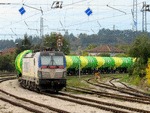 A private electric locomotive SIEMENS Vectron with number 91 52 10 81 972 - 7 , owned by private operator "PIMK Rail" at railway station Vakarel with freight train.