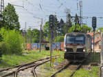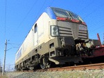 A private electric locomotive SIEMENS Vectron with number 91 52 10 81 972 - 7 , owned by private operator "PIMK Rail" at railway station Svilengrad before pulling a freight train.