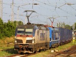 A private electric locomotive SIEMENS Vectron with number 91 52 10 81 972 - 7 , owned by private operator "PIMK Rail" standing at railway station Kazichene with freight train.