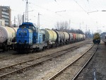 A private 55270-3 of company "Port Rail" , standing at railway station Kostinbrod after shunting with freight cars.