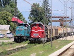 A 2 private diesel shunters , both owned by company "Port Rail" at railway station Pirdop shunting with freight cars.