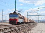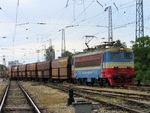 A private electric locomotive with number 91 52 00 43 556 - 7 , owned by private operator TPPBD ("Termo Power Plant Bobov Dol") at railway station Pazardjik with freight train.