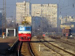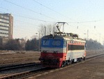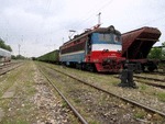 A private electric locomotive with number 91 52 00 43 556 - 7 , owned by private operator TPPBD ("Termo Power Plant Bobov Dol") at central railway station Plovdiv with freight train.