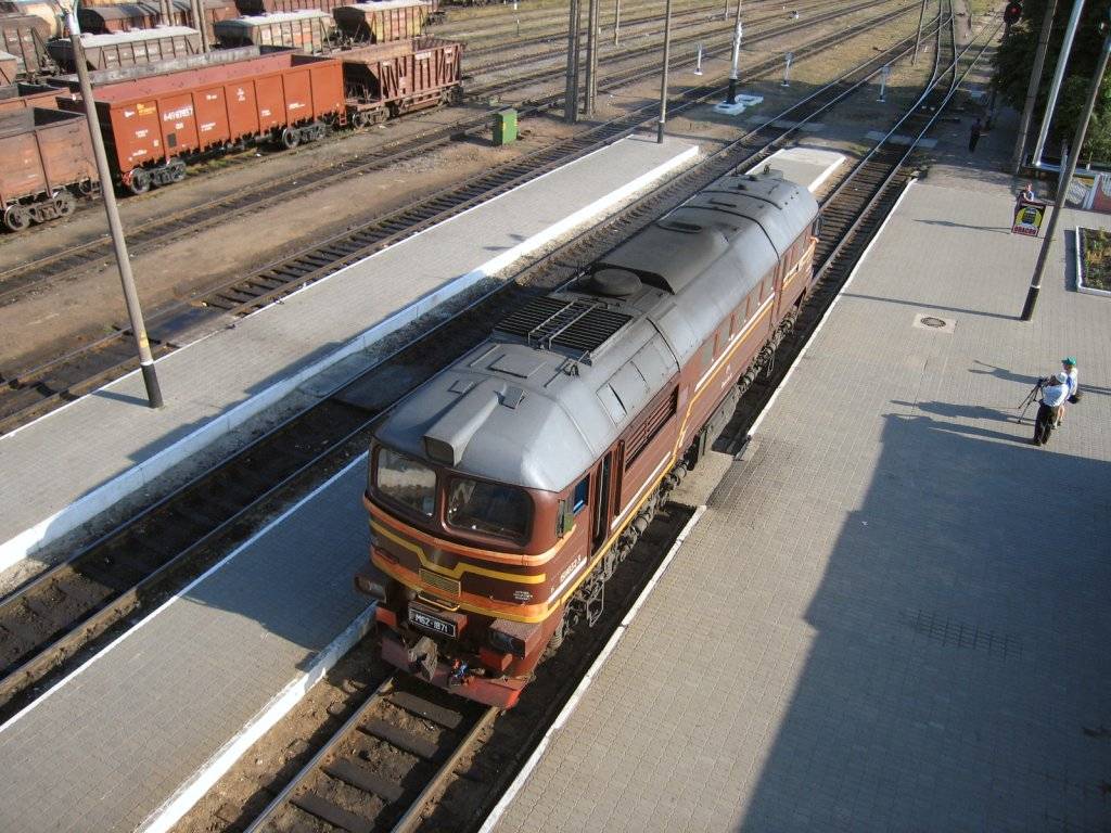 BC - Belarus Diesel locomotive M62-1871 has just arrived with an extra passenger train (the Ukrainian Dzherelo train with Belgian, Dutch and French railway fans) and will now run around its train. Luninetz, 16-07-2005 Digital photo by Marco van Uden |