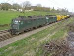Every Morning at 08:30 (Tuesday till friday) there is an Ae 6/6 Meeting in Rafz (Zürich - Schaffhausen Line). This mornig the red 11477 meets the green 11502 and 11469 (10.03.2004).