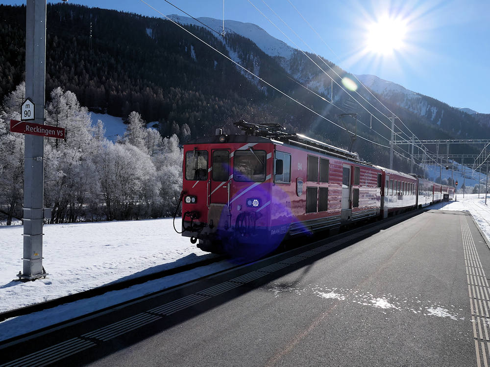 MGB - Switzerland The train from Visp and Brig to Andermatt, with motor car Deh 4/4 nr. 96 leading, arrives at Münster(VS). Münster, 03-01-2022 Digital photo by Marco van Uden |