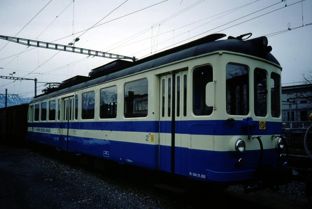 Be4/4 1002 of the MOB in the depot of Zweisimmen on 15 October 1987.