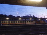 A second class passenger car of DB (Deutsche Bahn / German Railways) type "Bimz" standing at railway station Bratislava hl.st. in composition of EC 282 "Slovenska Strela" in early morning. This is weird for me , `cause this train has a destination Bratislava hl.st. - Praha hl.n. and no carry a DB cars.