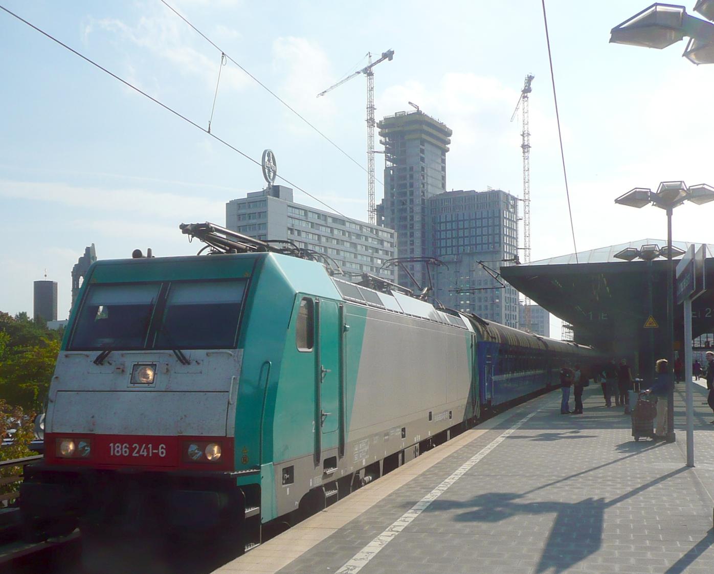 | The 91 80 6 186 241-6 looks like an angel leasing locomotive, but according to inscriptions belongs to "DB Fernverkehr AG, FM Hamburg". Pulling the D 443 "Moskva-Express", today consisting of two BC WLABm to Minsk, two RZD WLABm to S.Peterburg, four RZD WLABmee and one RZD WLSRmee to Moskva, at the end the 234 278-0 was pushing. Berlin Zoologischer Garten, 2010-09-24. |