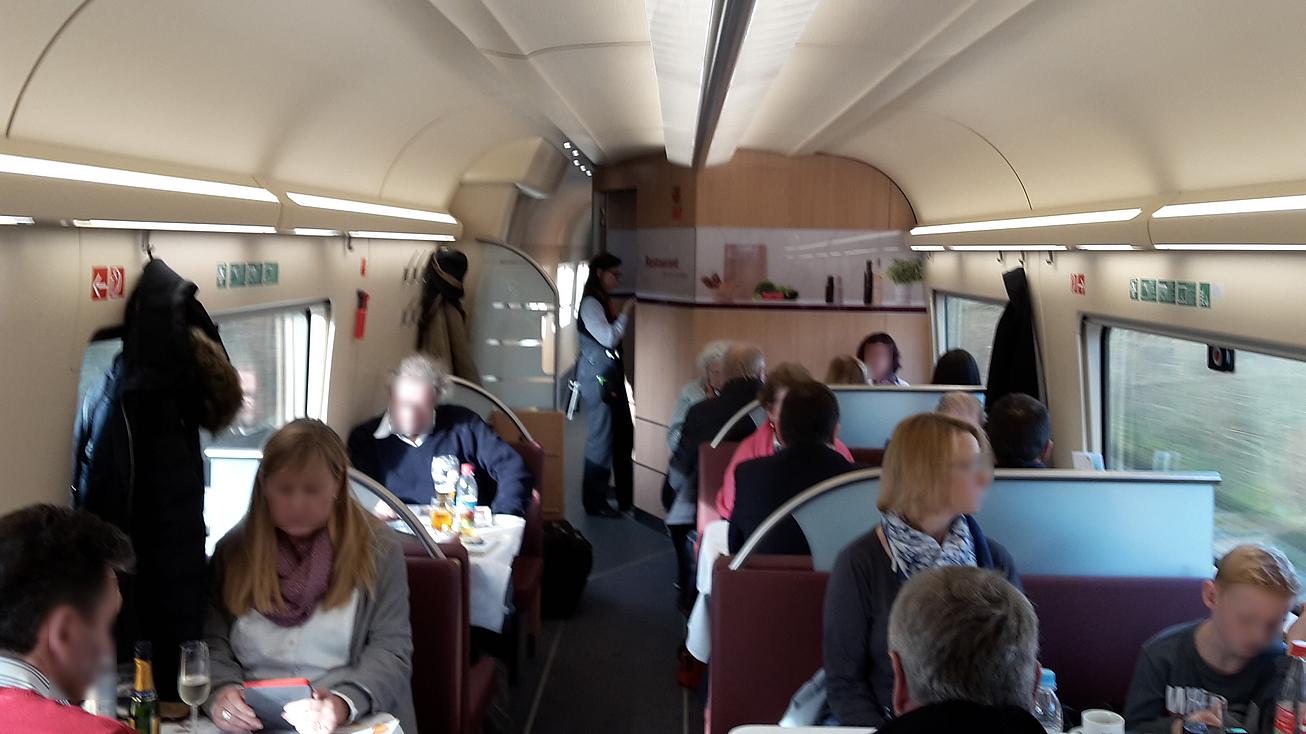 | New trainset 9006 of class 412/812 operating as ICE 787 (Hamburg Altona to München Hbf). Interior of the restaurant. 2016-11-24. |