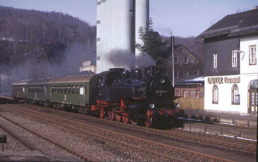 Regrettably playing only a small part in Plandampf Aue, was 2-8-2T 86 1001, which hauled just one or two trains. She is here seen departing from Lauter (Sachs) with a stopping passenger service for Schwarzenberg. 24 February 1992.