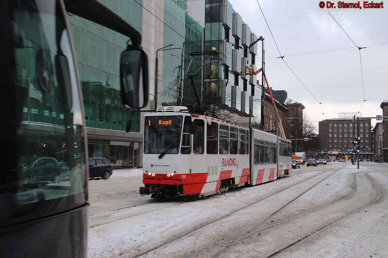 | Wagen 99 auf der Linie 1 nach Kopli, kam 1985 als KT4SU in die estnische Hauptstadt und ist nach entsprechendem Umbau dreiteilig unterwegs. Dr. Sternol, Eckart (Foto) Dr-Sternol@t-online.de |
