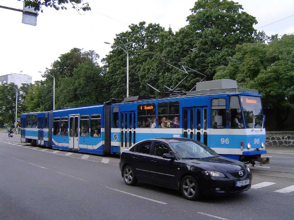 Tallinn: Tram 96 is on route 4 to Ülemiste near the Viru stop. There are four tram lines and two types of trams - Tatra KT4 and KT6 (seen here), which basically is a KT4 with a lowered middle-section.