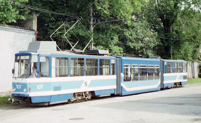 On the 24th of August 2001 Tallinn's tram had 113th anniversary. KT4 (No. 107) rebuilt to KTNF6 was introduced. New tram has a low-floor mid-section. The photo on the left is made in July when test-rides were made.