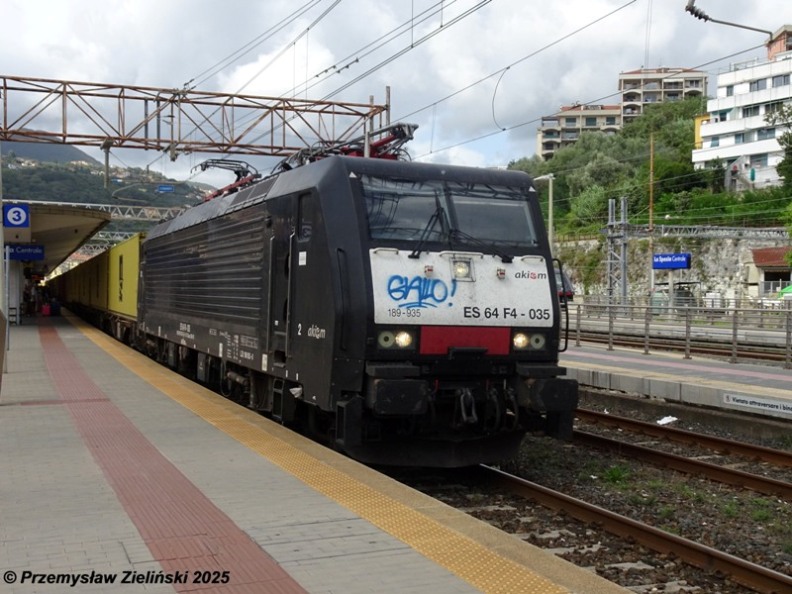Electric Loco 189 934 ES64 F4-034 (NVR 91 80 6189 934-3 D-AKIEM) in full black colors on lease to Medway Italia is running southbound with a container train at San Giorgio di Piano BO Station. 04/01/2024.
